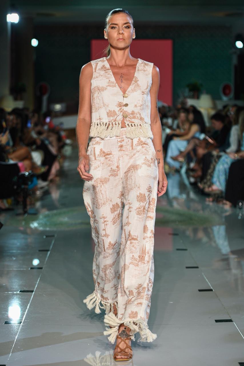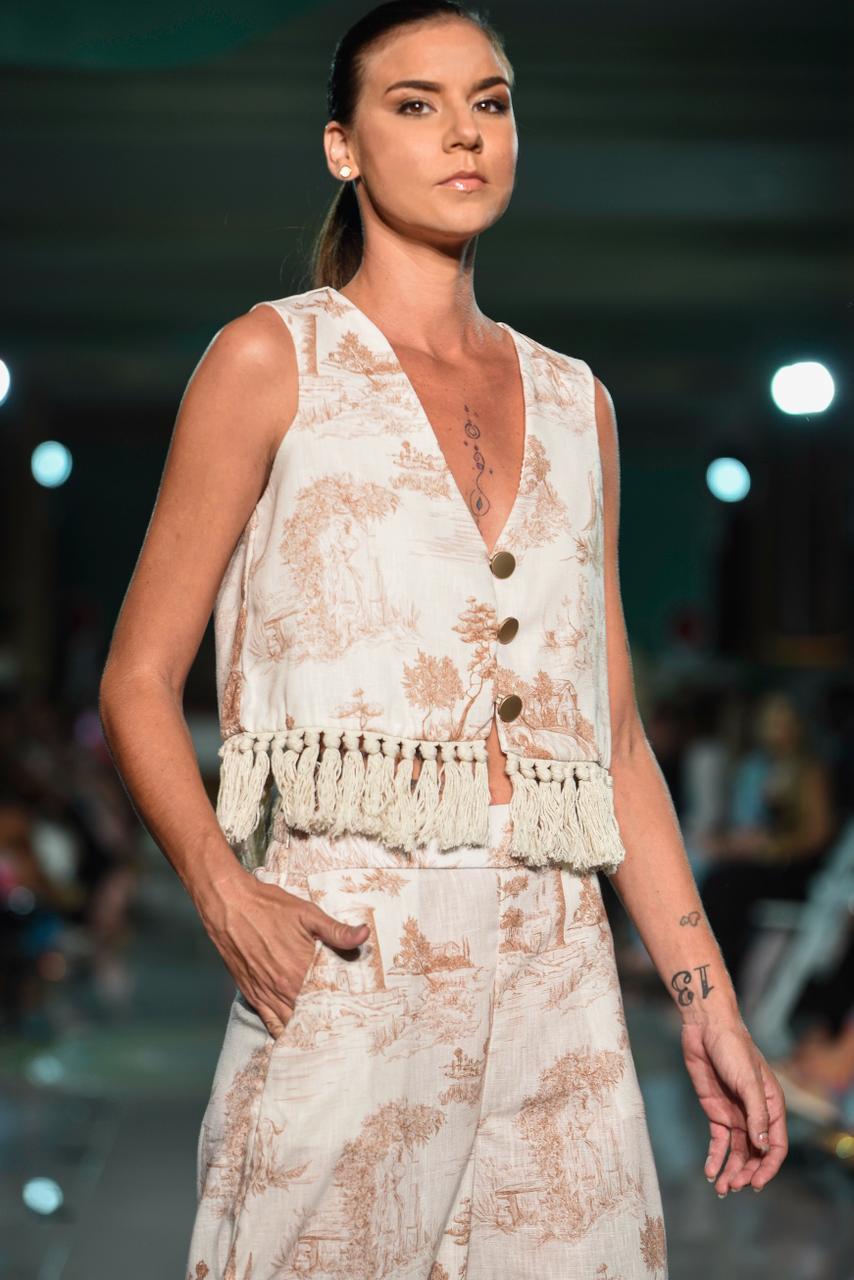 Este chaleco corto destaca por su estampado Toile de Jouy exclusivo que narra paisajes clásicos en tonos tierra sobre una base de lino. El diseño presenta un escote en V profundo con cierre de botones dorados y un llamativo acabado de flecos artesanales en el bajo que aporta textura y movimiento a esta pieza clave de la colección