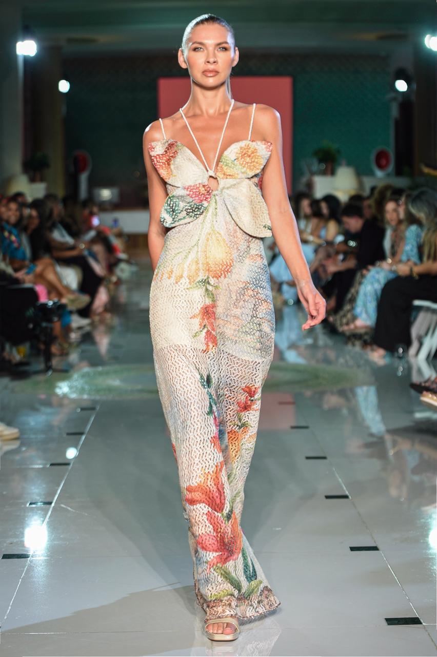 Vestido largo de silueta estilizada, confeccionado en una delicada malla con estampado floral de la Riviera Francesa exclusivo, diseñado especialmente para la marca. Su escote protagonista, con pétalos estructurados y finos tirantes, evoca jardines en flor bañados por el sol del Mediterráneo, mientras el corte al cuerpo realza la figura con sofisticación y sensualidad. La caída fluida y los detalles artesanales aportan movimiento, frescura y un aire etéreo a la pieza