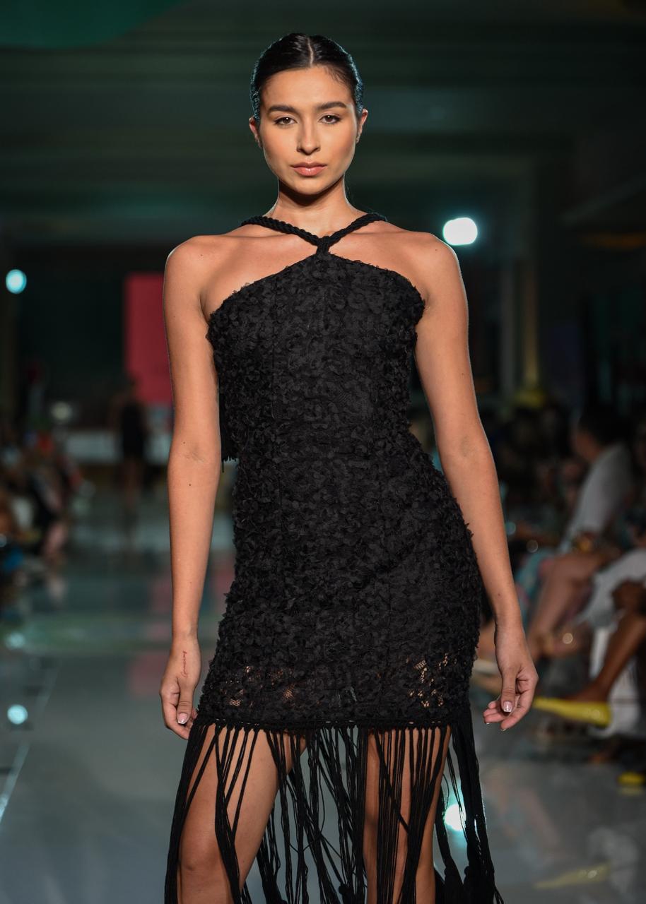 Vestido corto confeccionado en delicado encaje negro, enriquecido con un acabado de finos pétalos de chiffon que aportan movimiento y sofisticación. Incorpora flecos 100% artesanales y cordones ajustables en el cuello con terminaciones en pompones, elaborados a mano por nuestros artesanos colombianos, resaltando el valor de lo hecho a mano y la exclusividad de cada pieza.
