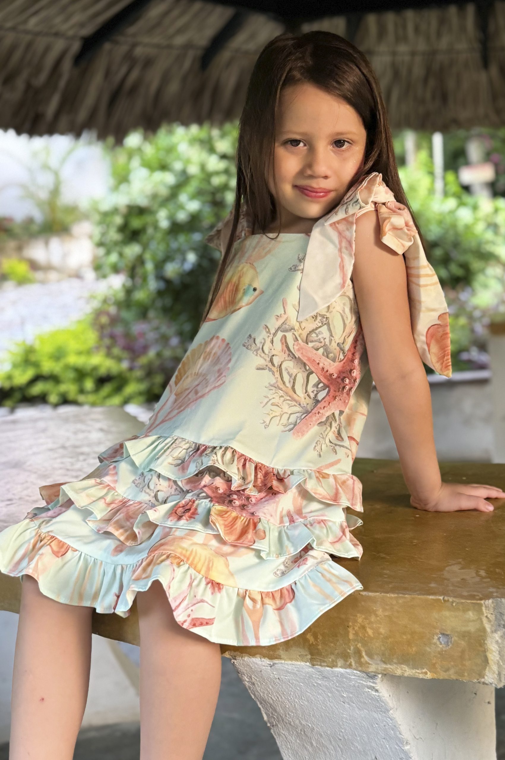 Vestido corto de 3 boleros y tiras de amarrar en hombro, print estrella marina y peces exclusivo de la marca.
