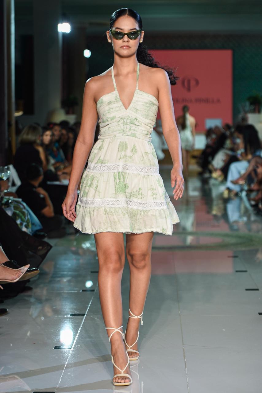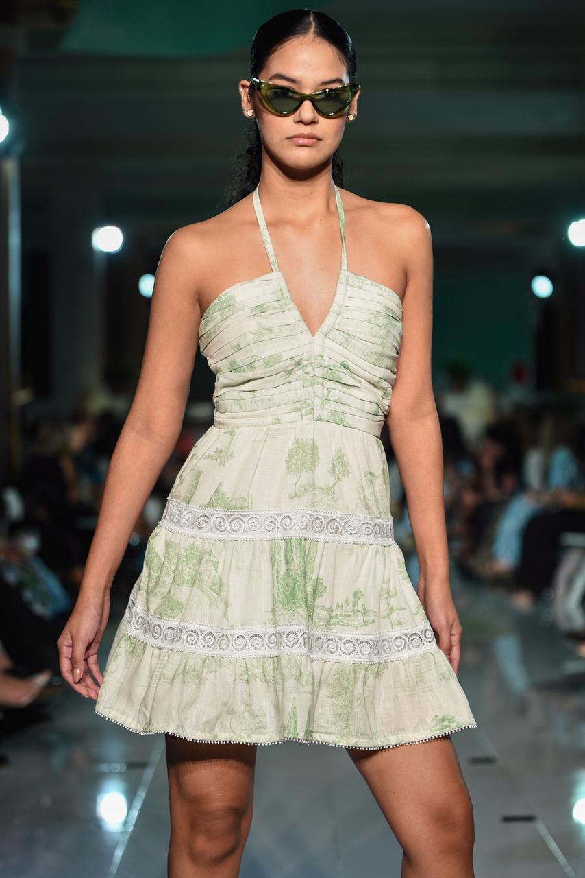 Cuenta con un favorecedor escote tipo halter y un cuerpo estructurado mediante pliegues suaves que realzan la figura. El diseño se complementa con una falda de vuelo ligero adornada con detalles de encaje calado horizontal y un delicado estampado botánico inspirado en Toile De Jouy en tonos verdes sobre una base clara.