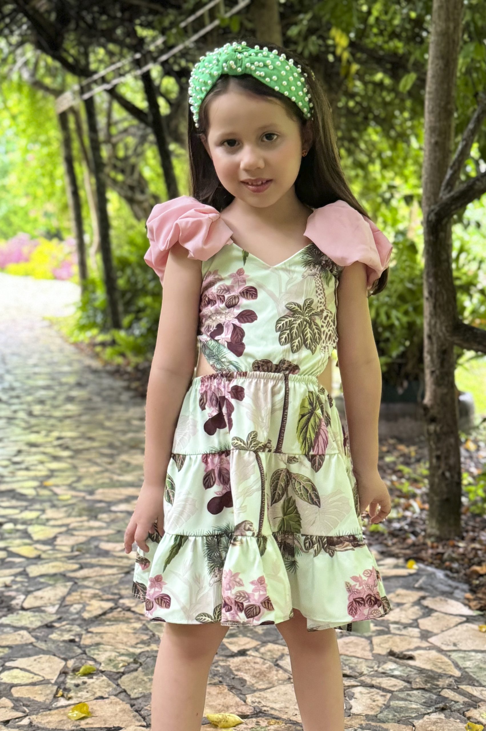 Vestido corto de boleros tipo globo para mangas y espalda de amarrar, falda en capas. Print exclusivo de la marca motivo safari
