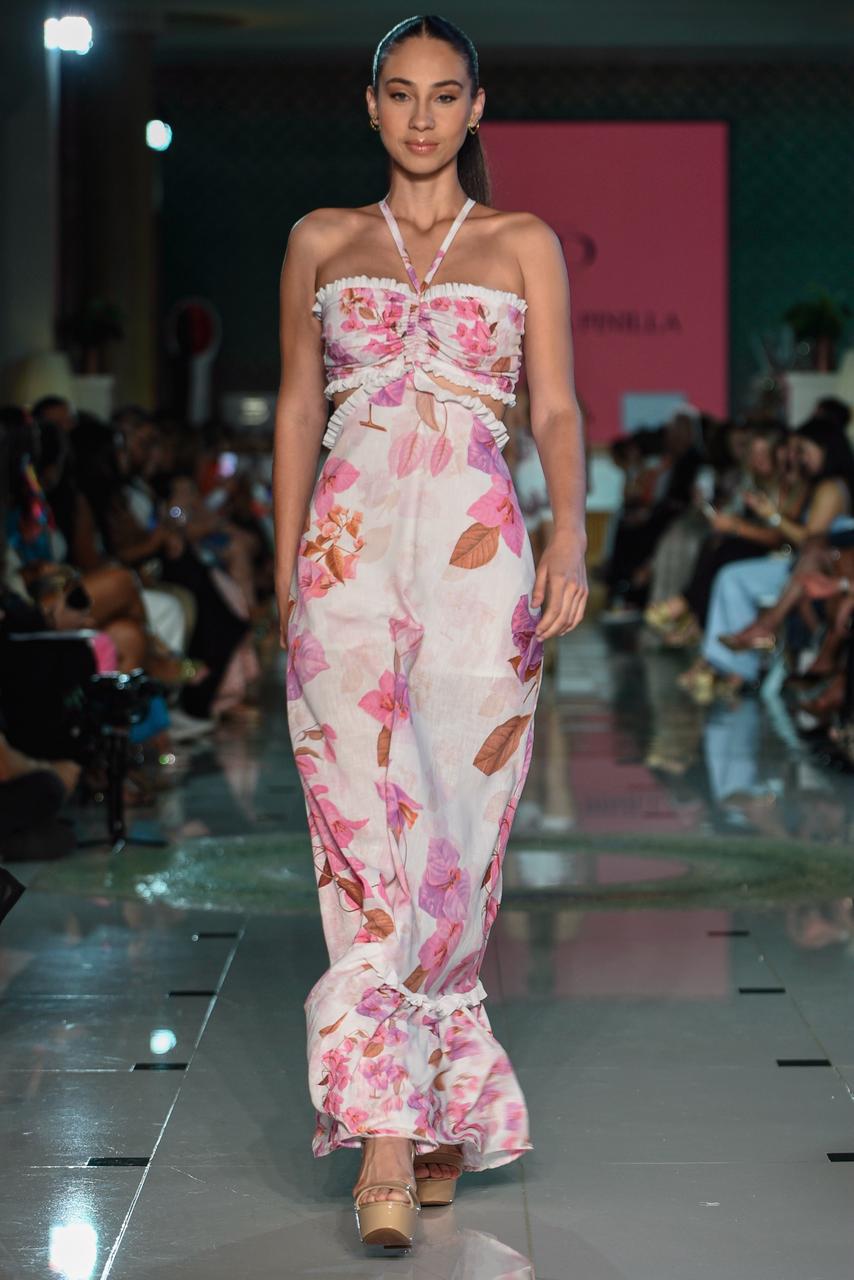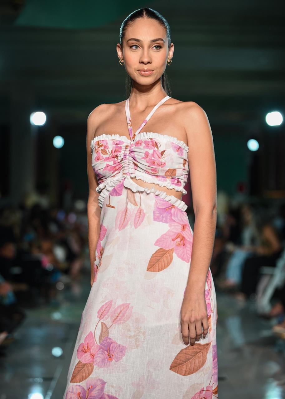 Inspirado en el romanticismo de la Riviera francesa, este vestido largo presenta un print exclusivo de buganvilias sobre un tejido de lino. El diseño destaca por su escote halter fruncido y modernas aberturas cut-out en la cintura, acentuadas con delicados mini volantes que realzan la silueta con elegancia sofisticada.
